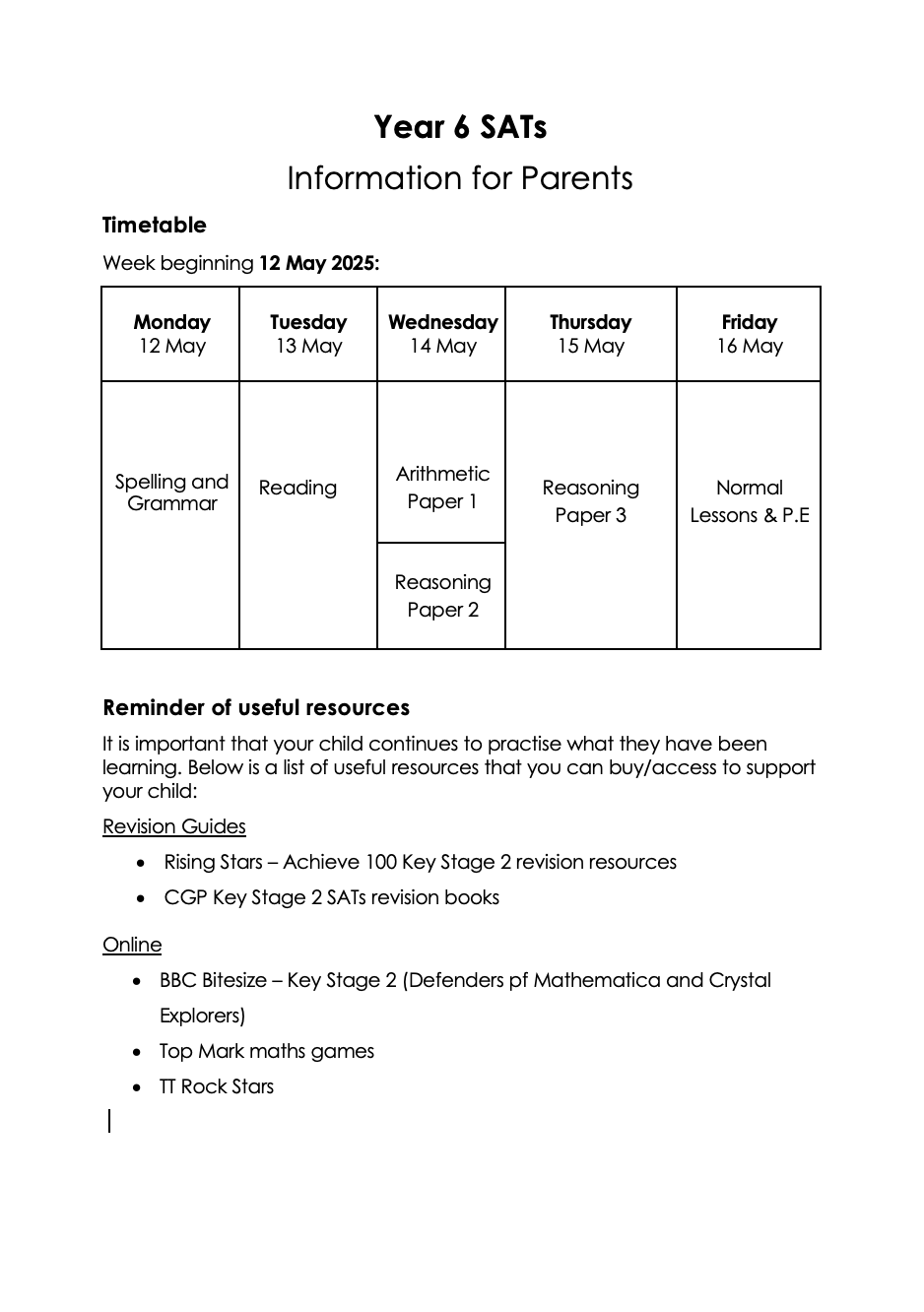 SATS Reminders for Parents