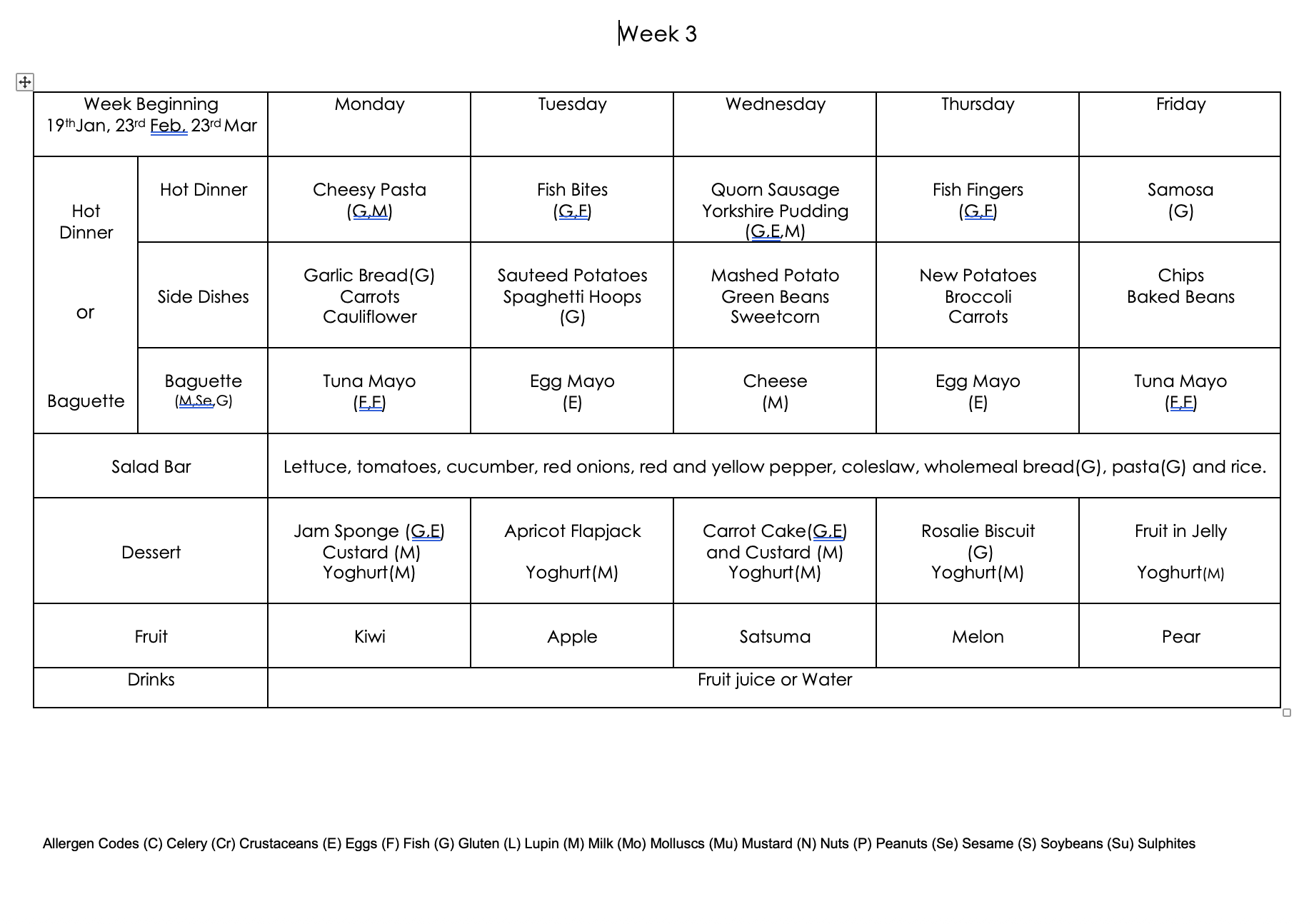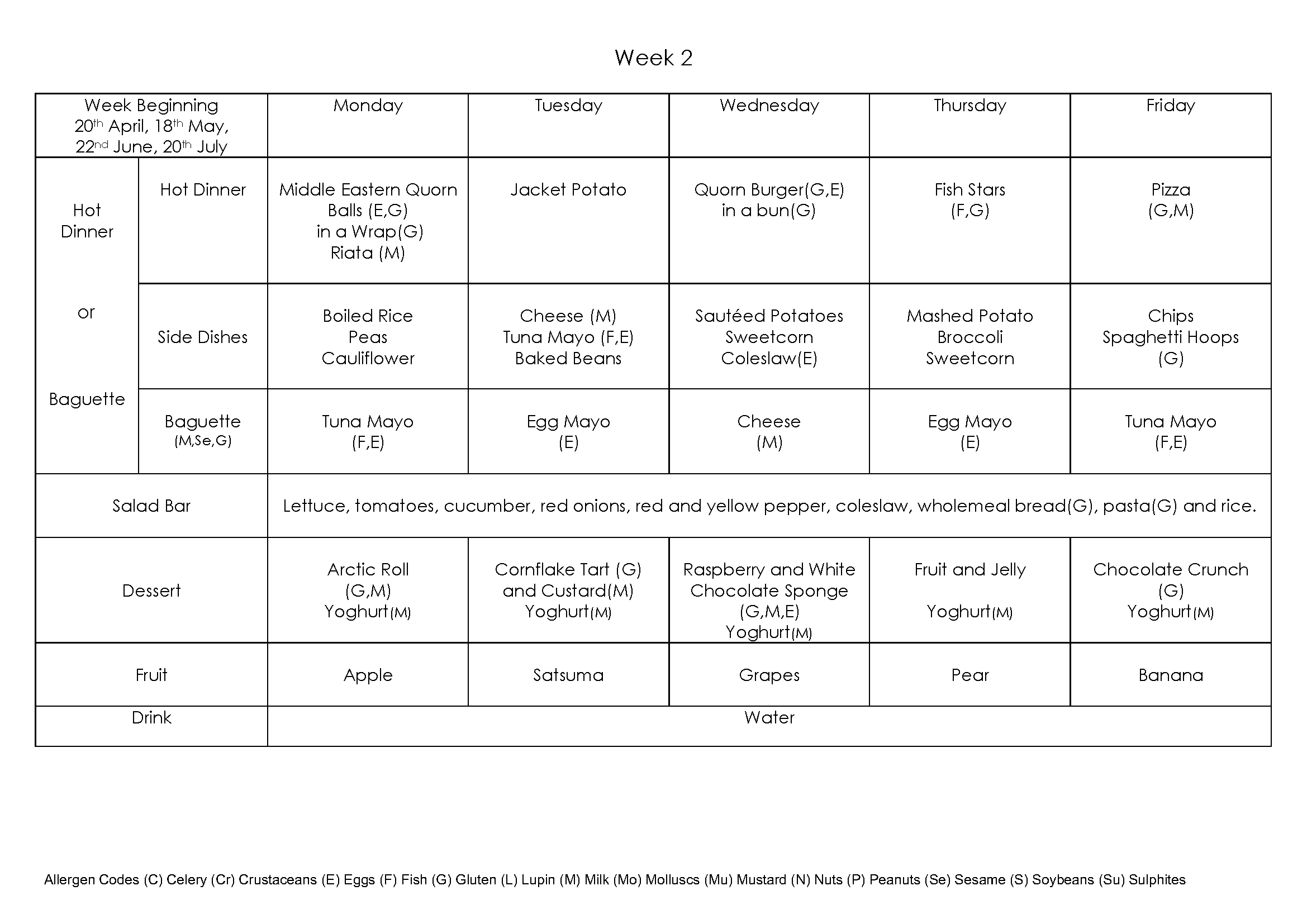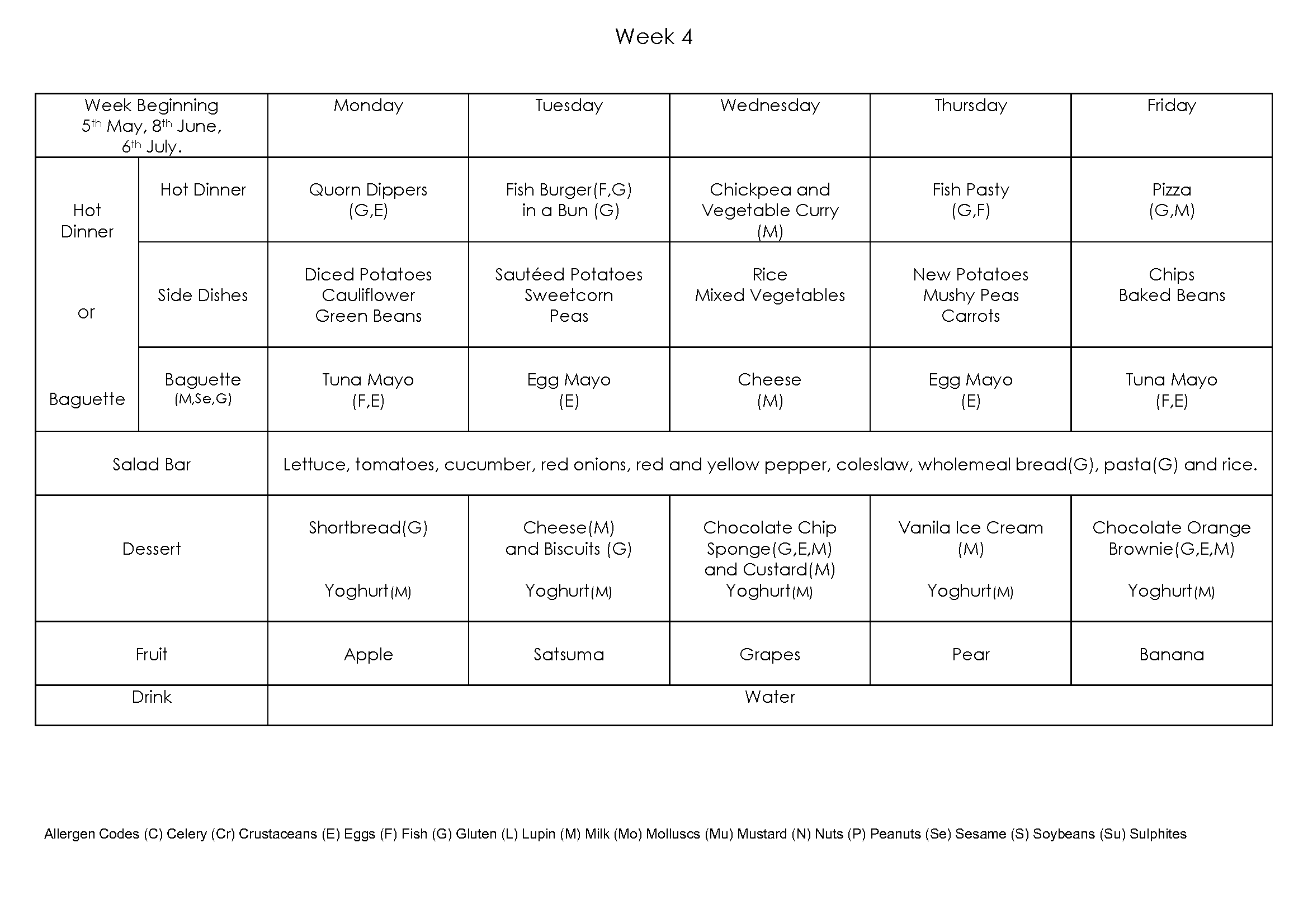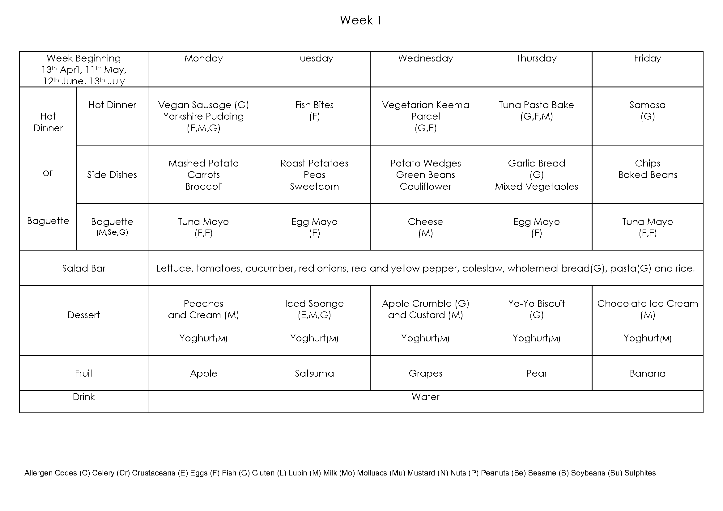 Children in FS, Year 1 and Year 2 and all children receiving Universal Free School Meals, receive a school lunch on school trip days. A typical meal includes the following. please click on the bus to view the meal and details of any allergies. Children with allergies will be catered for individually.