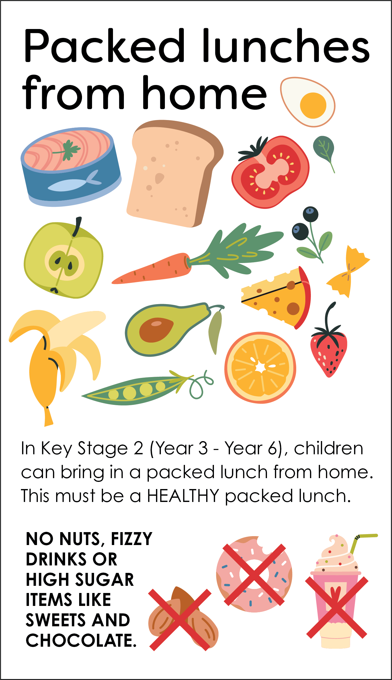 Key stage 2 children may bring a packed lunch from home. All packed lunches must be brought to school by children in the morning. Please do not include NUTS, fizzy drinks, or sweets/chocolate bars.